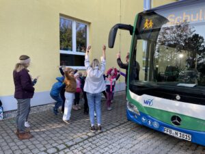Der Unterricht fand in einem echten Linienbus statt. Frau Dörfel (LA FFB) stellte typische Situationen nach, die beim Warten an der Haltestelle, während der Busfahrt oder beim Aussteigen entstehen können. Gemeinsam mit den Kindern wurde besprochen und geübt, wie man sich in diesen Momenten richtig und sicher verhält.