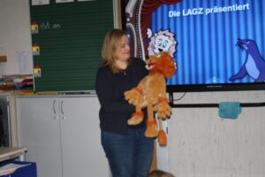 Wie putzt man richtig Zähne und warum ist Zahnpflege so wichtig? Diese Fragen standen im Mittelpunkt, als Zahnärztin Frau Dr. Amberg gemeinsam mit dem Löwen Dentalus unsere Grundschule besuchte.
