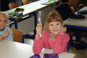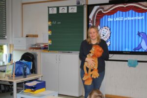 In jeder Klasse erklärte Frau Dr. Amberg auf kindgerechte Weise, was gute Zahnhygiene bedeutet und wie man seine Zähne gesund und stark hält. Löwe Dentalus zeigte anschaulich, wie richtiges Zähneputzen funktioniert – Schritt für Schritt, mit großen Bewegungen und viel Spaß. Die Kinder machten begeistert mit und konnten zeigen, dass sie schon echte Putzprofis sind.